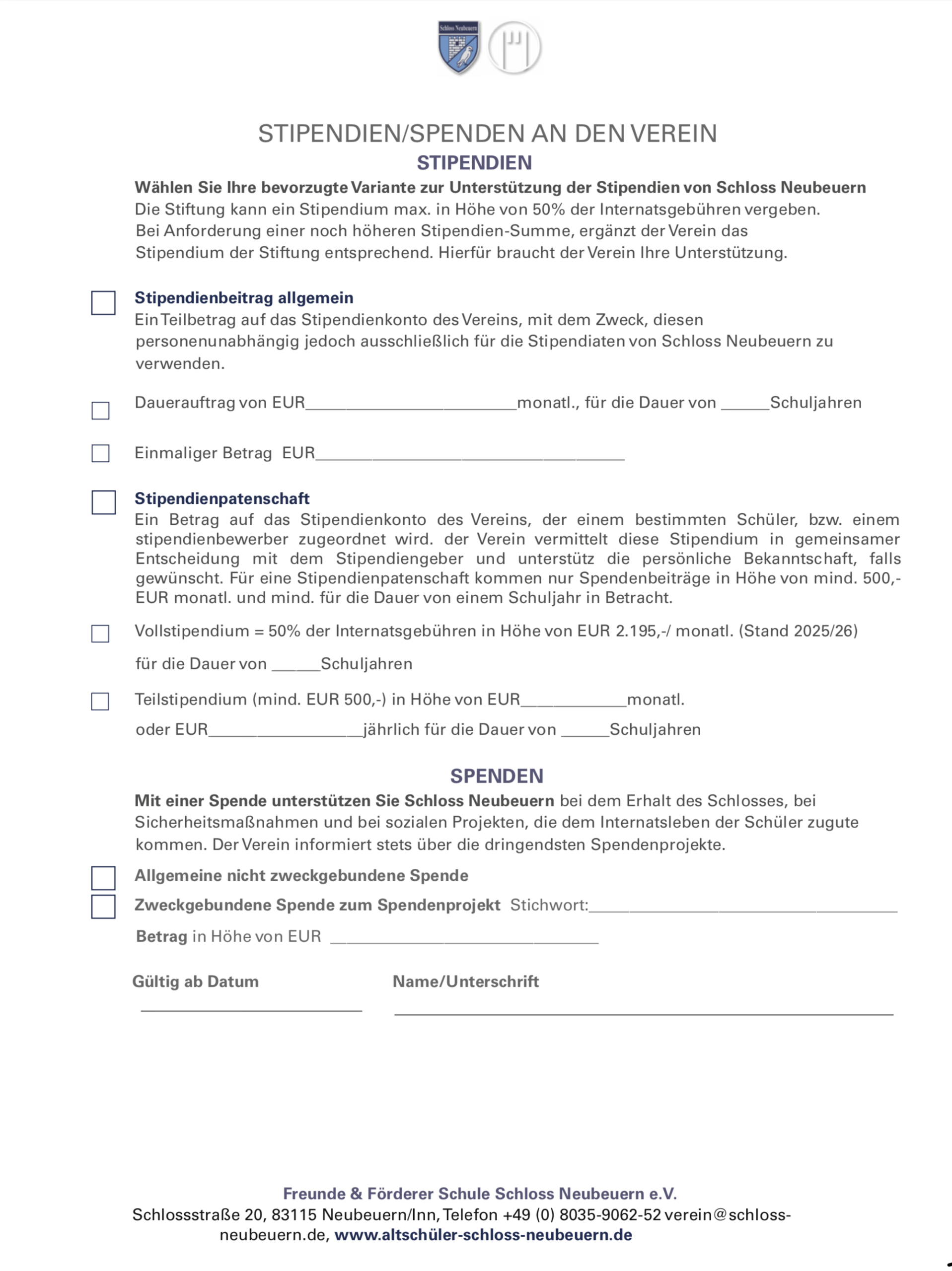 Beachten Sie, dass Sie immer die Wahl haben, dem Verein eine freie Spende oder eine zweckgebundene Spende zu überweisen. Gerne entscheiden wir für Sie, wofür Schloss Neubeuern Ihre Spende am dringendsten braucht. In jedem Fall kommt Ihre Spende den Stipendien oder dem Erhalt der Schule Schloss Neubeuern zugute.